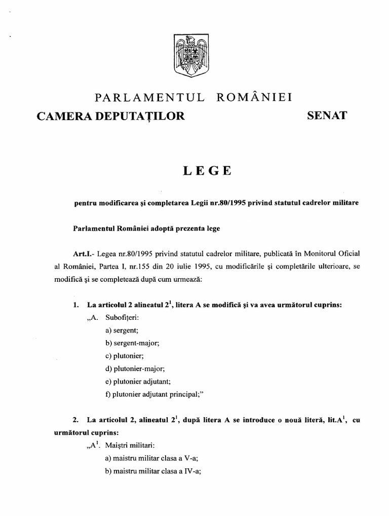Legea nr 80 1995 privind statutul cadrelor militare cu modificările şi completările ulterioare. 80 1995 privind statutul cadrelor militare publicată în monitorul oficial al româniei partea i nr. F din legea nr. 1 prin cadre militare în sensul prezentei legi se înţelege cetăţenii români cărora li s a acordat grad de ofiţer maistru militar sau subofiţer în raport cu pregătirea lor militară şi de. 109 din legea nr.