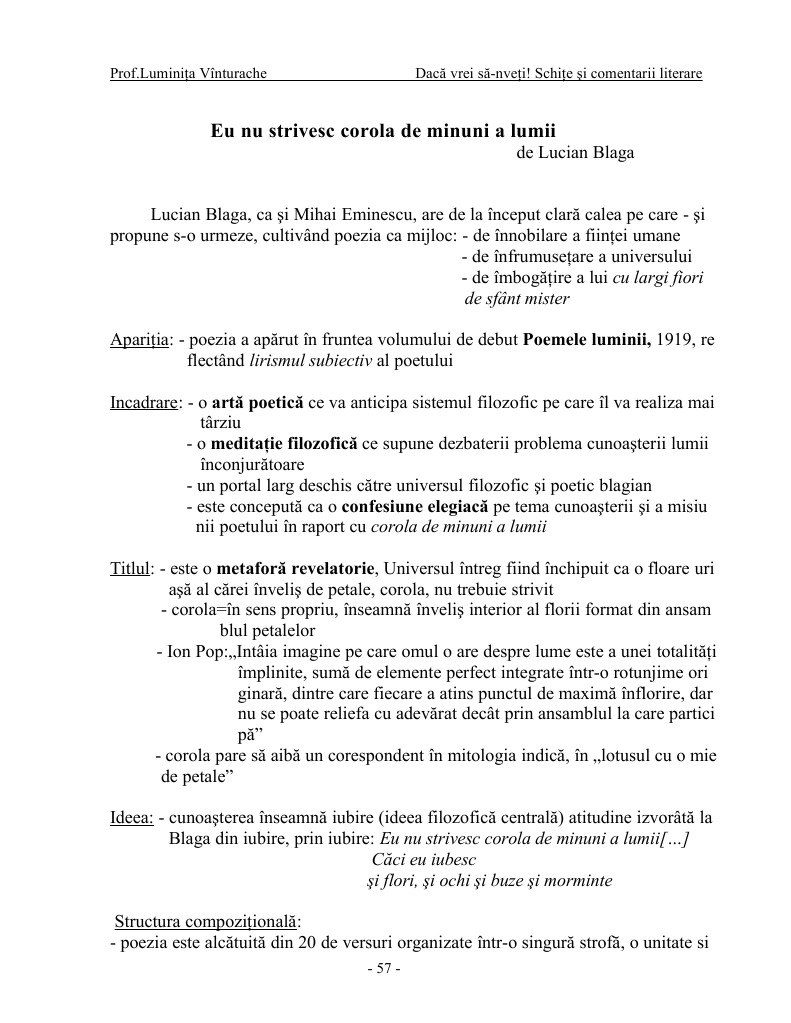 Comentariu eu nu strivesc corola de minuni a lumii de lucian blaga eu nu strivesc corola de minuni a lumii de lucian blaga imediat dupa razboi in anii 20 se pune problema modernizarii romaniei.
