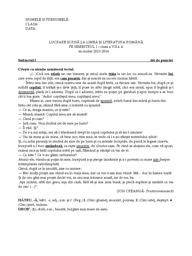 Lucrare scrisă limba si literatura romana an scolar 2018 2019 semestrul al ii lea clasa a vii a. 2 model de teza la romana clasa a v a anunţuri meditaţii prima pagină. Lucrare scrisă semestrială la limba şi literatura română pe semestrul al ii lea clasa a v a. Citeşte cu atenţie textul următor când se trezi din somn fetiţa auzi un vaiet prelung.