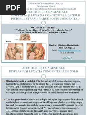 Buna ziua ma numesc raileanu simona si sant cu luxatie congenitala de sold bilaterala din nastere am avut o viata normala si nu ma durut nimic am 2 copii nascuti prin cezariana dar de 2 luni am dureri din sold pana jos la glezna iar piciorul prezinta parestezii din cand in cand am facut rmn si am constatat ca am 2 hernii de disc una de 6 mm si. Luxatia congenitala de sold este o afectiune a copilariei cauzata de o dezvoltarea anormala a articulatiei soldului. Este destul de greu de diagnosticat in multe cazuri iar netratarea afectiunii congenitale poate avea urmari grave. Soldul stang este mai des afectat decât cel drept datorita faptului ca exista o tendinţa a fătului de a se plasa cu spatele spre partea stângă a mamei.