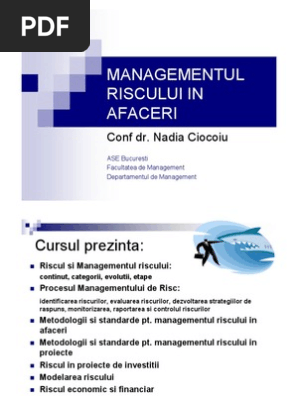 Riscul este o componenta fireasca a vietii economico sociale care are la origine cauze multiple si imbraca forme foarte variate. Managementul unei afaceri proiect presupune pe langa identificarea principalelor riscuri legate de comportamentul decizional al elementelor decidente punerea in evidenta a categoriilor de riscuri ce intervin atunci cand sunt puse in practica elementele decizionale. Evaluarea impactului expunerea la risc managemen tul riscului evaluarea probabilitatii mecanisme specifice mecanisme generale. De asemenea sunt detaliate cerintele standardului iso 31000 2018 si modul lor de aplicare in practica.