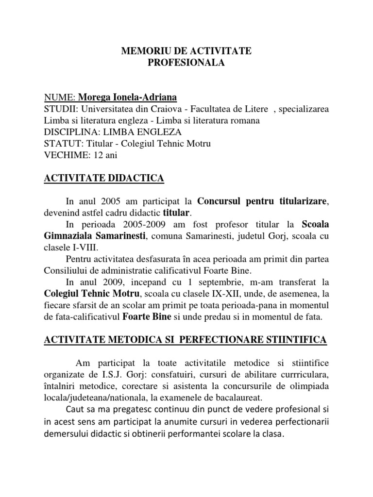 Petrică data şi locul naşterii 06 03 1964 com cepari jud. Un model de memoriu de activitate necesar la inscrierea la grade didactice. Facultatea de medicină specialitatea medicină generală diploma de licenţă anul 2005. Memoriu de activitate profesională didactică şi ştiinţifică numele dicu prenumele.