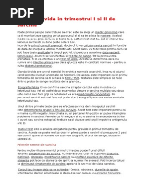 In trimestrul 3 de sarcina se fac unele analize din trimestrul 1 precum hemoleucograma bochimie profilul de coagulare sumar de urina si urocultura secretie vaginala culturi pentru depistarea streptococului de grup b si ecografie de morfologie fetala trimestrul 3. Trimestrul 1 de sarcina. Trimestrul 3 exemplu de meniu. Dieta unei gravide în primul trimestru de sarcină în primul trimestru de sarcină este recomandat să alegi alimente bogate în acid folic bune pentru dezvoltarea sistemului nervos al fătului.