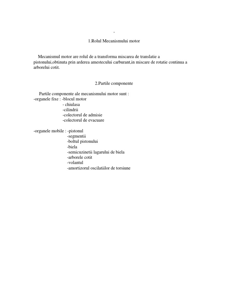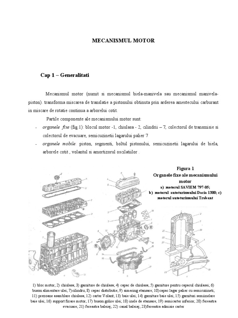 Materialele din care sunt confecționate organele sale componente sa aibă un coeficient de dilatare mic deoarece in caz contrar datorita temperaturilor mari la care funcționează aceasta ar putea conduce la blocarea mecanismului greutate minima a organelor mobile pentru a reduce la minim forțele de inerție. Mecanismul motor mai este numit si mecanismul bielă manivelă. Arhiva contine 1 fisier doc de 15 pagini. Blocul motor 1 chiulasa 2 cilindrii 7 colectorul de admisie şi colectorul de evacuare semicuzineţii lagărului palier 7 fig.